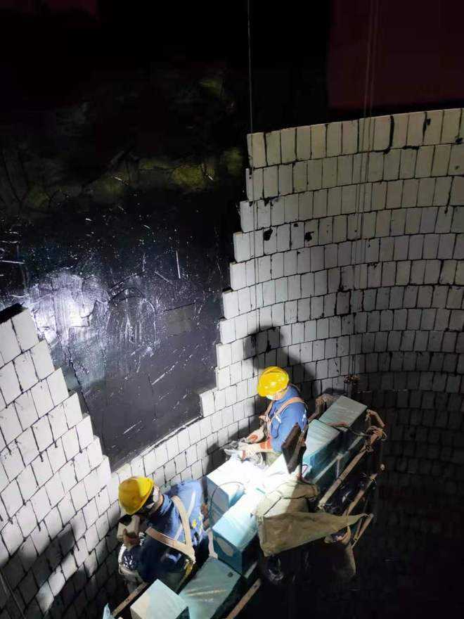 :平台优化:采用 “可升降模块化平台”,可沿内壁上下移动,同时容纳 3-4 人同步作业,较传统固定平台效率提升 50%;材料运输:通过 “垂直升降料斗”运输瓷砖、胶泥,避免人工搬运导致的材料损耗与体力消耗,总工期缩短至 25 天。